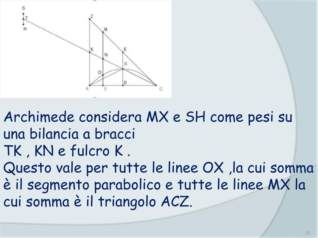 Archimede considera MX e SH come pesi su una bilancia a bracci TK , KN e fulcro K . Questo vale per tutte le linee OX ,la cui somma è il segmento parabolico e tutte le linee MX la cui somma è il triangolo ACZ.
