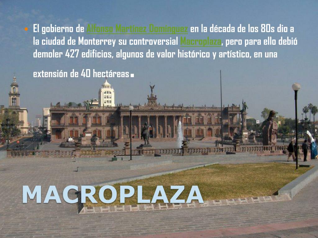 El gobierno de Alfonso Martínez Domínguez en la década de los 80s dio a la ciudad de Monterrey su controversial Macroplaza, pero para ello debió demoler 427 edificios, algunos de valor histórico y artístico, en una extensión de 40 hectáreas. MACROPLAZA