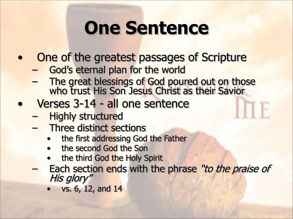 One Sentence • One of the greatest passages of Scripture • God’s eternal plan for the world • The great blessings of God poured out on those who trust His Son Jesus Christ as their Savior • Verses 3-14 - all one sentence • Highly structured • Three distinct sections • the first addressing God the Father • the second God the Son • the third God the Holy Spirit • Each section ends with the phrase “to the praise of His glory” • vs. 6, 12, and 14