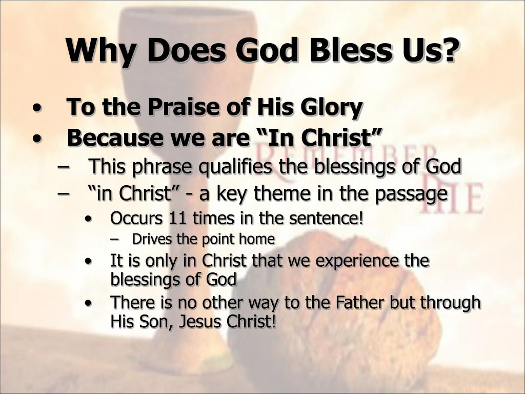Why Does God Bless Us? • To the Praise of His Glory • Because we are “In Christ” • This phrase qualifies the blessings of God • “in Christ” - a key theme in the passage • Occurs 11 times in the sentence! • Drives the point home • It is only in Christ that we experience the blessings of God • There is no other way to the Father but through His Son, Jesus Christ!