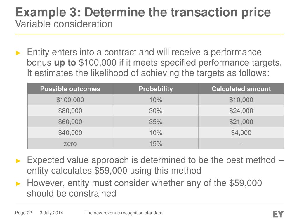 Entity enters into a contract and will receive a performance bonus up to $100,000 if it meets specified performance targets. It estimates the likelihood of achieving the targets as follows: Expected value approach is determined to be the best method – entity calculates $59,000 using this method However, entity must consider whether any of the $59,000 should be constrained Example 3: Determine the transaction price Variable consideration The new revenue recognition standard