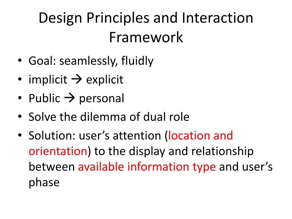 Design Principles and Interaction Framework • Goal: seamlessly, fluidly • implicit explicit • Public personal • Solve the dilemma of dual role • Solution: user’s attention (location and orientation) to the display and relationship between availableinformationtype and user’s phase