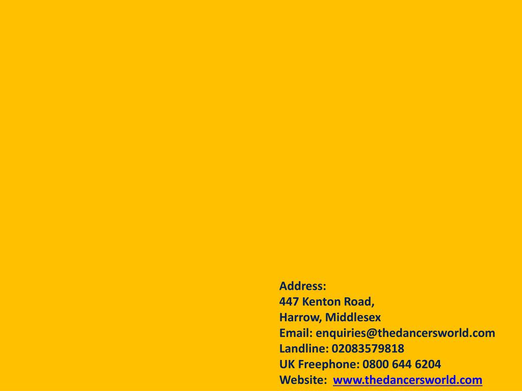 Address: 447 Kenton Road, Harrow, Middlesex Email: enquiries@thedancersworld.com Landline: 02083579818 UK Freephone: 0800 644 6204 Website: www.thedancersworld.com