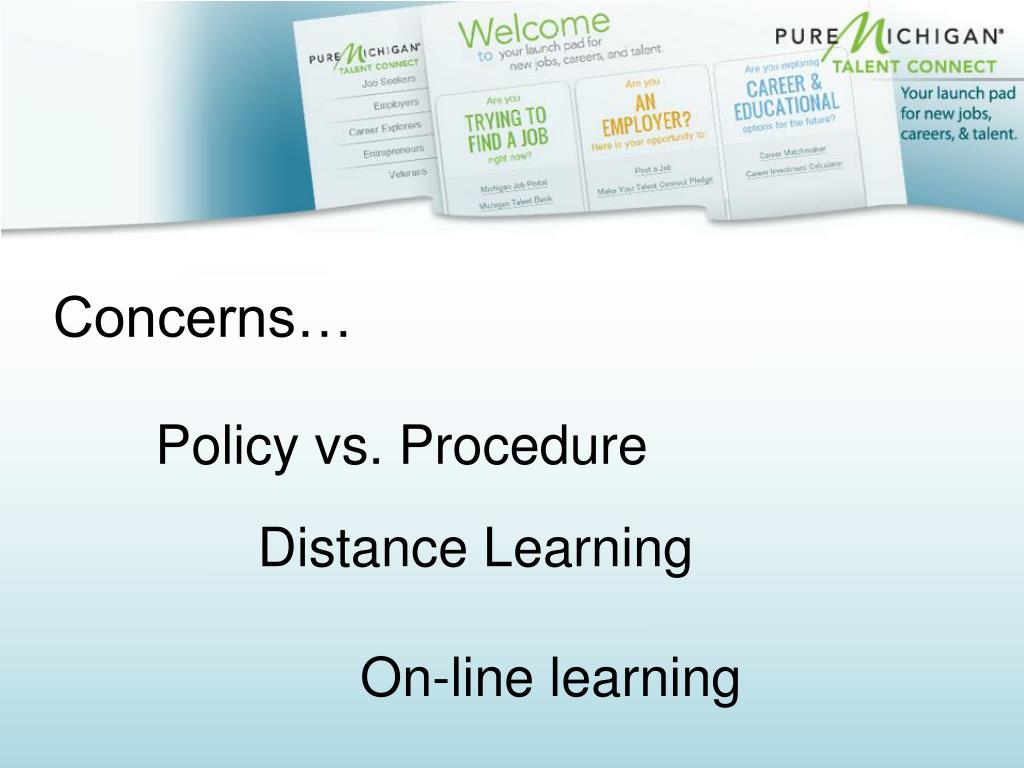 Concerns… Policy vs. Procedure Distance Learning On-line learning