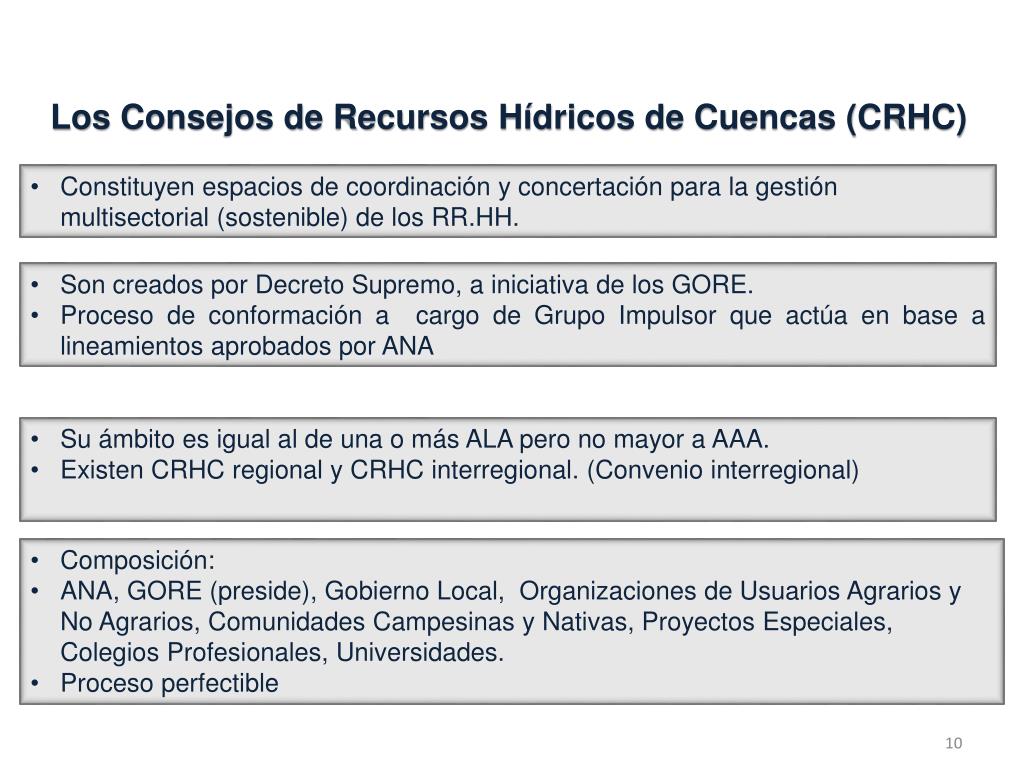 Los Consejos de Recursos Hídricos de Cuencas (CRHC) • Constituyen espacios de coordinación y concertación para la gestión multisectorial (sostenible) de los RR.HH. • Son creados por Decreto Supremo, a iniciativa de los GORE. • Proceso de conformación a cargo de Grupo Impulsor que actúa en base a lineamientos aprobados por ANA • Su ámbito es igual al de una o más ALA pero no mayor a AAA. • Existen CRHC regional y CRHC interregional. (Convenio interregional) • Composición: • ANA, GORE (preside), Gobierno Local, Organizaciones de Usuarios Agrarios y No Agrarios, Comunidades Campesinas y Nativas, Proyectos Especiales, Colegios Profesionales, Universidades. • Proceso perfectible