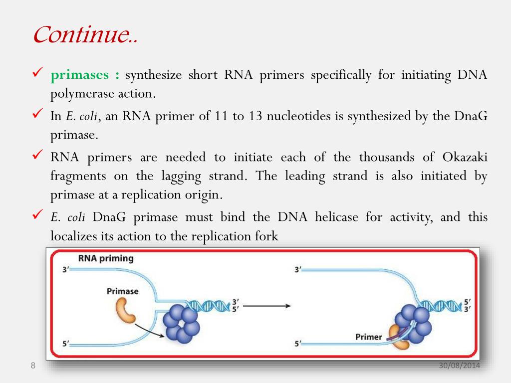Continue.. • primases : synthesize short RNA primers specifically for initiating DNA polymerase action. • In E. coli, an RNA primer of 11 to 13 nucleotides is synthesized by the DnaG primase. • RNA primers are needed to initiate each of the thousands of Okazaki fragments on the lagging strand. The leading strand is also initiated by primase at a replication origin. • E. coli DnaG primase must bind the DNA helicase for activity, and this localizes its action to the replication fork