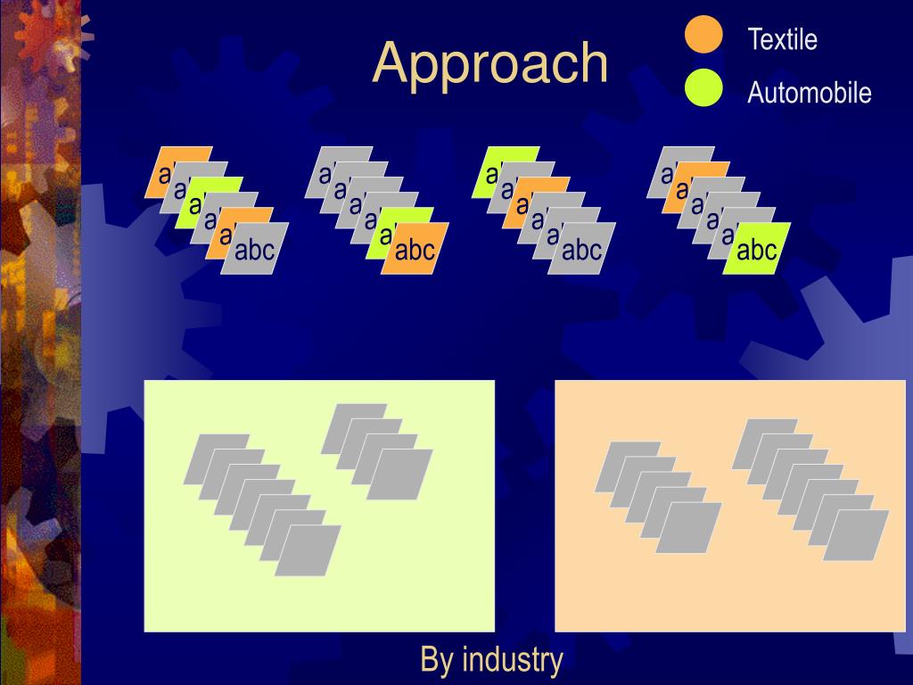 German Textile Approach French Automobile By country abc abc abc abc By industry abc abc abc abc