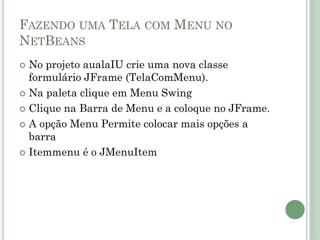 Fazendo uma Tela com Menu no NetBeans • No projeto aualaIU crie uma nova classe formulário JFrame (TelaComMenu). • Na paleta clique em Menu Swing • Clique na Barra de Menu e a coloque no JFrame. • A opção Menu Permite colocar mais opções a barra • Itemmenu é o JMenuItem