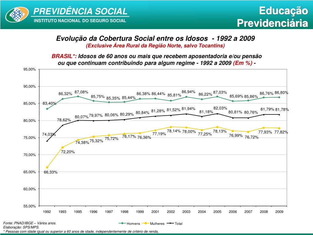 Evolução da Cobertura Social entre os Idosos - 1992 a 2009 (Exclusive Área Rural da Região Norte, salvo Tocantins) BRASIL*: Idosos de 60 anos ou mais que recebem aposentadoria e/ou pensão ou que continuam contribuindo para algum regime - 1992 a 2009 (Em %) - Fonte: PNAD/IBGE – Vários anos. Elaboração: SPS/MPS. * Pessoas com idade igual ou superior a 60 anos de idade, independentemente de critério de renda,