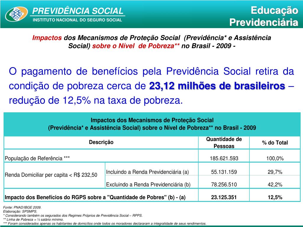 Impactosdos Mecanismos de Proteção Social (Previdência* e Assistência Social) sobre oNível de Pobreza**no Brasil - 2009 - O pagamento de benefícios pela Previdência Social retira da condição de pobreza cerca de 23,12 milhões de brasileiros – redução de 12,5% na taxa de pobreza. Fonte: PNAD/IBGE 2009. Elaboração: SPSMPS. * Considerando também os segurados dos Regimes Próprios de Previdência Social – RPPS. ** Linha de Pobreza = ½ salário mínimo. *** Foram considerados apenas os habitantes de domicílios onde todos os moradores declararam a integralidade de seus rendimentos.