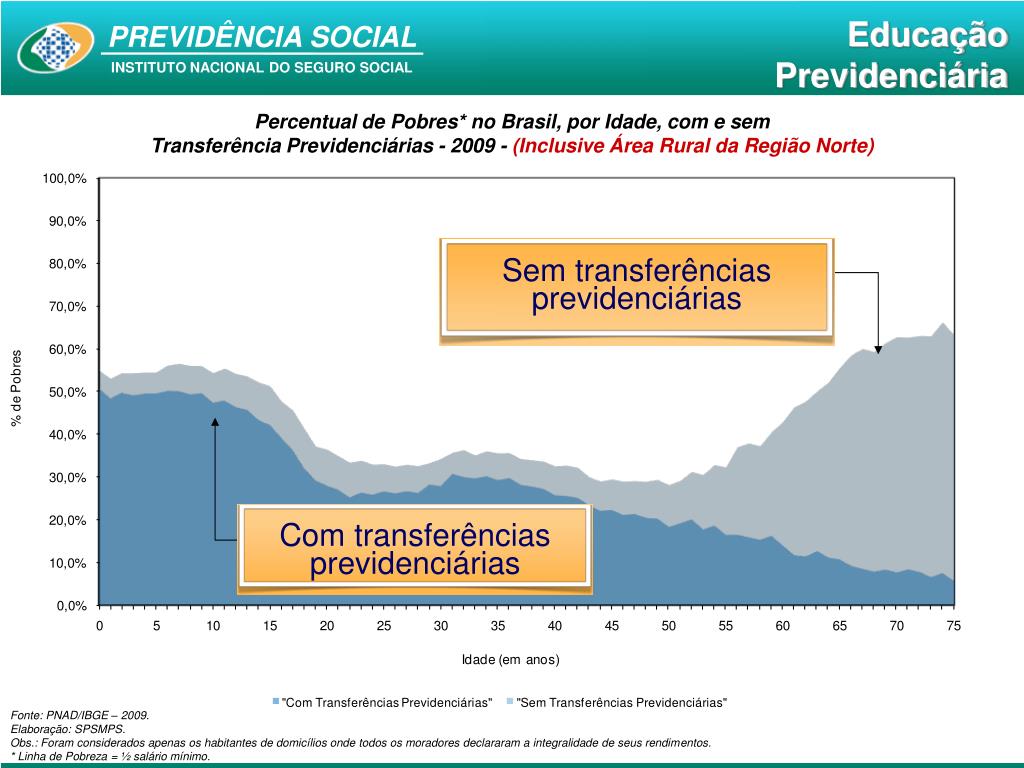 Sem transferências previdenciárias Com transferências previdenciárias Percentual de Pobres* no Brasil, por Idade, com e sem Transferência Previdenciárias - 2009 - (Inclusive Área Rural da Região Norte) Sem transferências previdenciárias Com transferências previdenciárias Fonte: PNAD/IBGE – 2009. Elaboração: SPSMPS. Obs.: Foram considerados apenas os habitantes de domicílios onde todos os moradores declararam a integralidade de seus rendimentos. * Linha de Pobreza = ½ salário mínimo.