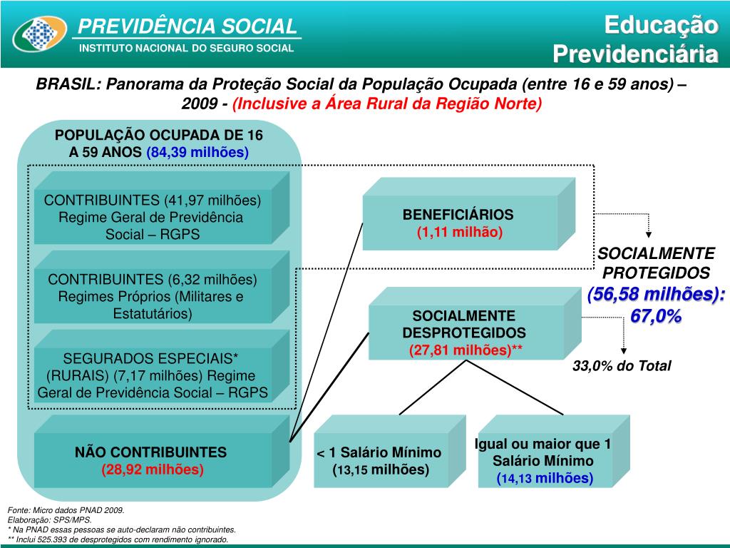 BRASIL: Panorama da Proteção Social da População Ocupada (entre 16 e 59 anos) – 2009 - (Inclusive a Área Rural da Região Norte) POPULAÇÃO OCUPADA DE 16 A 59 ANOS (84,39 milhões) CONTRIBUINTES (41,97 milhões) Regime Geral de Previdência Social – RGPS BENEFICIÁRIOS (1,11 milhão) SOCIALMENTE PROTEGIDOS (56,58 milhões): 67,0% CONTRIBUINTES (6,32 milhões) Regimes Próprios (Militares e Estatutários) SOCIALMENTE DESPROTEGIDOS (27,81 milhões)** SEGURADOS ESPECIAIS* (RURAIS) (7,17 milhões) Regime Geral de Previdência Social – RGPS 33,0% do Total NÃO CONTRIBUINTES (28,92 milhões) < 1 Salário Mínimo (13,15 milhões) Igual ou maior que 1 Salário Mínimo (14,13 milhões) Fonte: Micro dados PNAD 2009. Elaboração: SPS/MPS. * Na PNAD essas pessoas se auto-declaram não contribuintes. ** Inclui 525.393 de desprotegidos com rendimento ignorado.