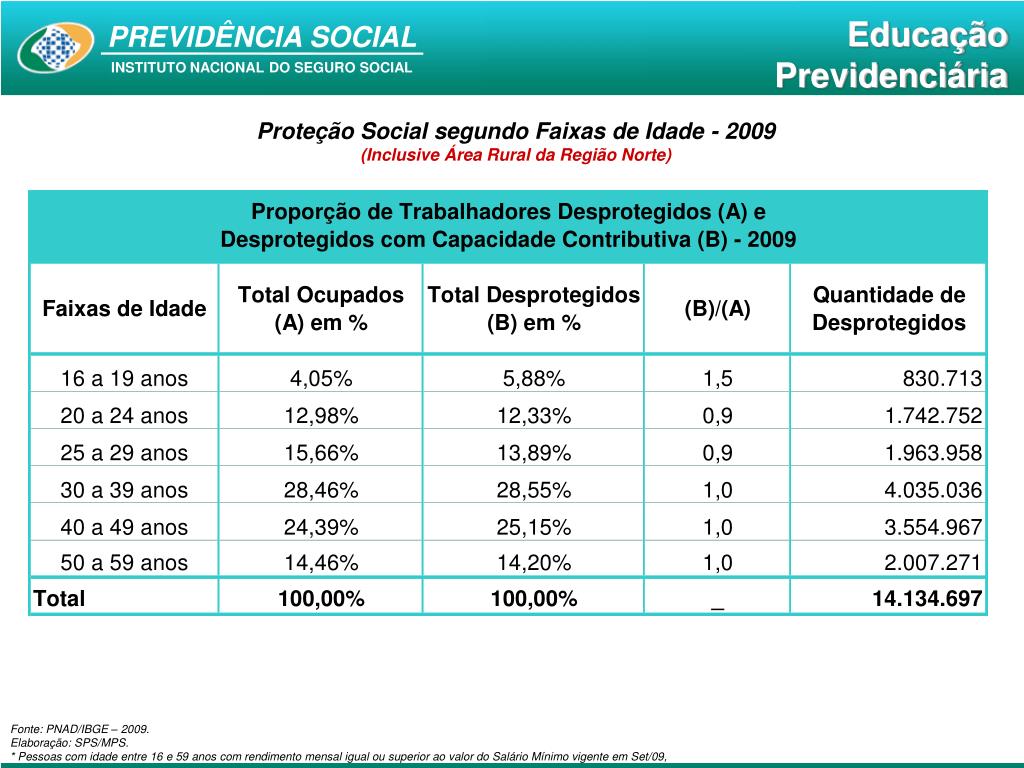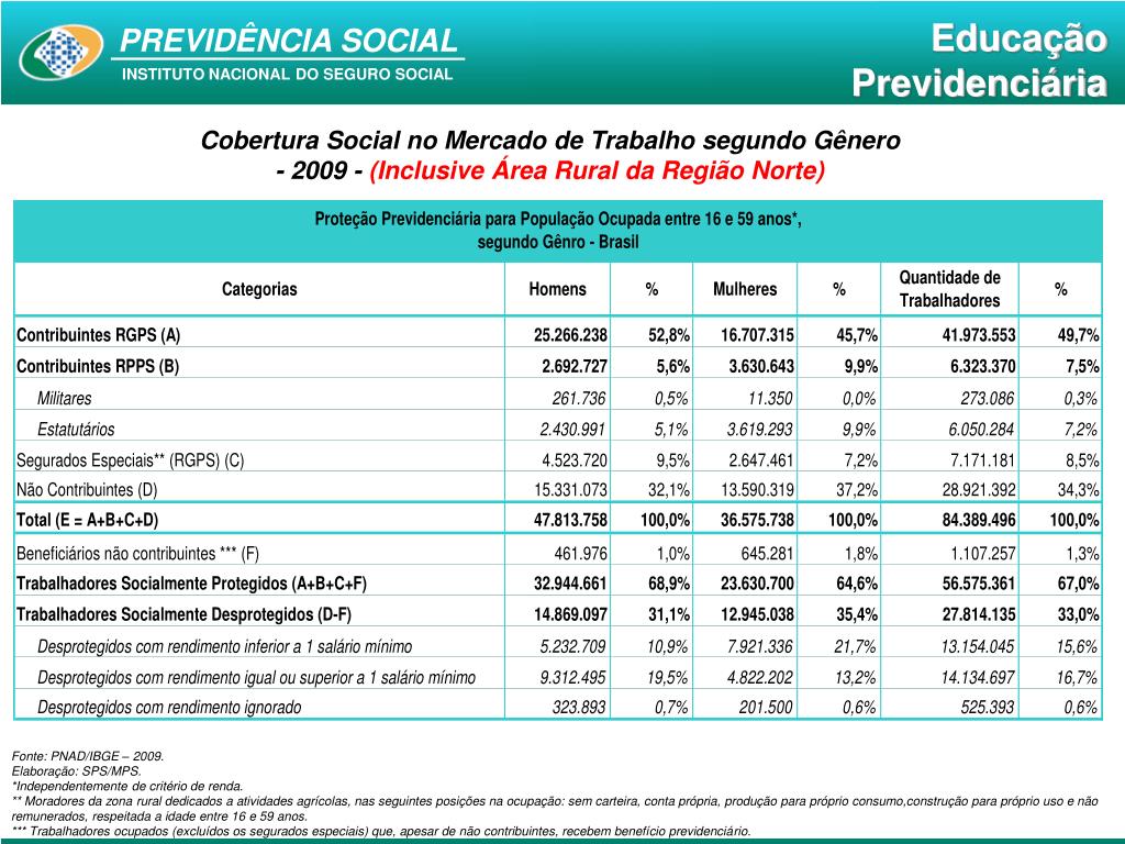 Proteção Social no Brasil De acordo com a PNAD, em 2009, existiam no Brasil 56,58 milhões pessoas, com idade entre 16 e 59 anos, protegidas pela Previdência Social, isso significa uma cobertura de 67,0%. Por outro lado, 27,81 milhões de trabalhadores (33,0% da população ocupada) encontram-se sem cobertura previdenciária. Isso significa que …