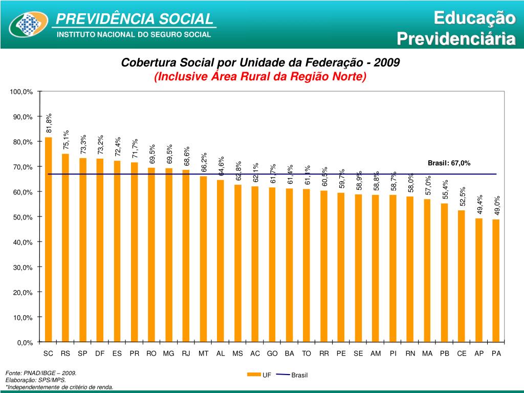 Cobertura Social por Unidade da Federação - 2009 (Inclusive Área Rural da Região Norte) Fonte: PNAD/IBGE – 2009. Elaboração: SPS/MPS. *Independentemente de critério de renda.