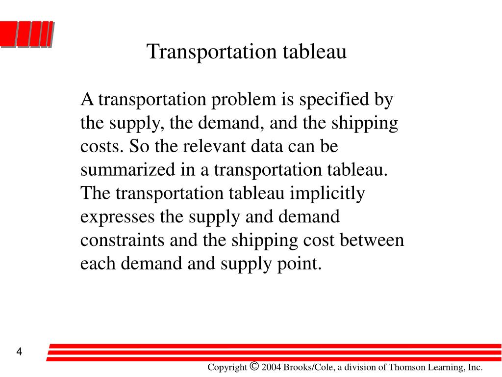 Transportation tableau A transportation problem is specified by the supply, the demand, and the shipping costs. So the relevant data can be summarized in a transportation tableau. The transportation tableau implicitly expresses the supply and demand constraints and the shipping cost between each demand and supply point.