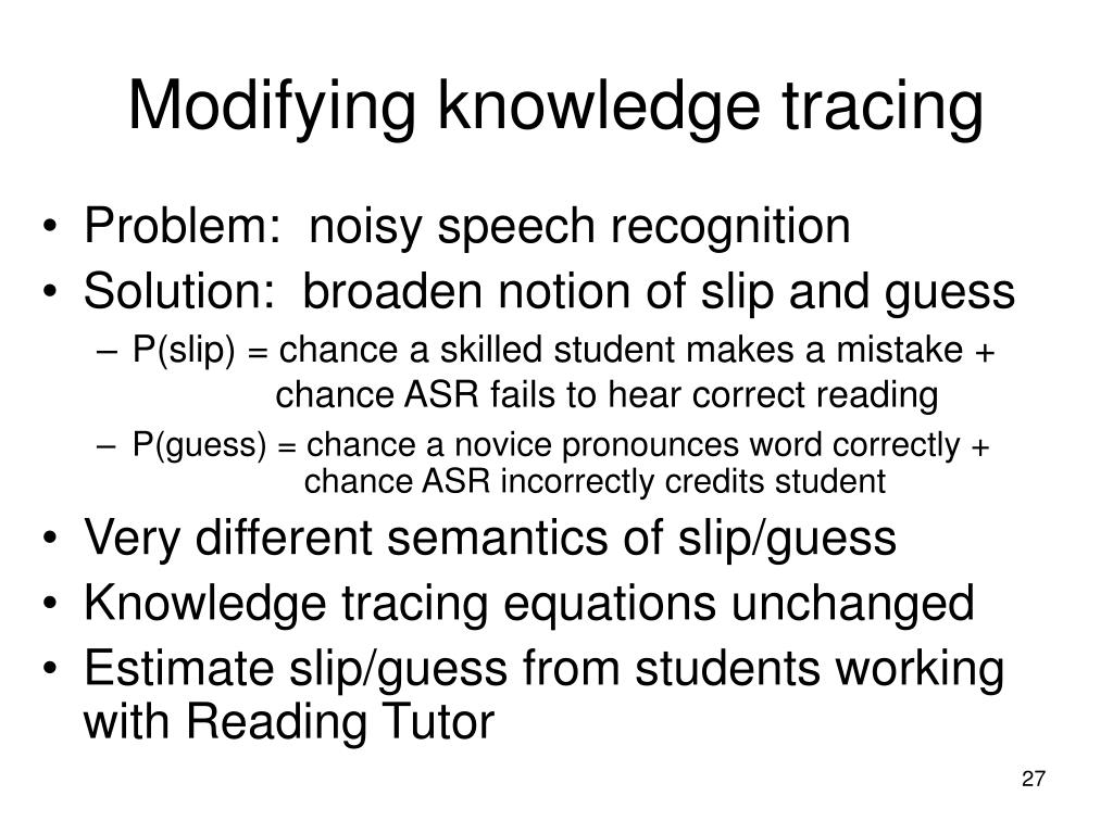Modifying knowledge tracing • Problem: noisy speech recognition • Solution: broaden notion of slip and guess • P(slip) = chance a skilled student makes a mistake + chance ASR fails to hear correct reading • P(guess) = chance a novice pronounces word correctly + chance ASR incorrectly credits student • Very different semantics of slip/guess • Knowledge tracing equations unchanged • Estimate slip/guess from students working with Reading Tutor