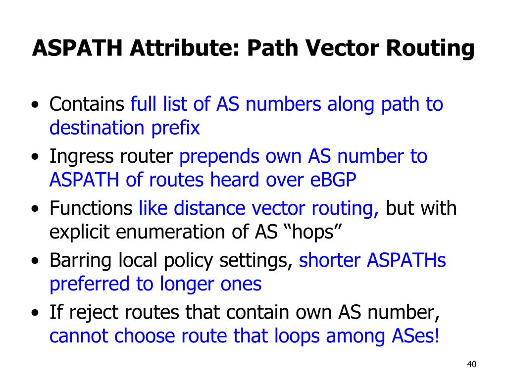 ASPATH Attribute: Path Vector Routing • Contains full list of AS numbers along path to destination prefix • Ingress router prepends own AS number to ASPATH of routes heard over eBGP • Functions like distance vector routing, but with explicit enumeration of AS “hops” • Barring local policy settings, shorter ASPATHs preferred to longer ones • If reject routes that contain own AS number, cannot choose route that loops among ASes!