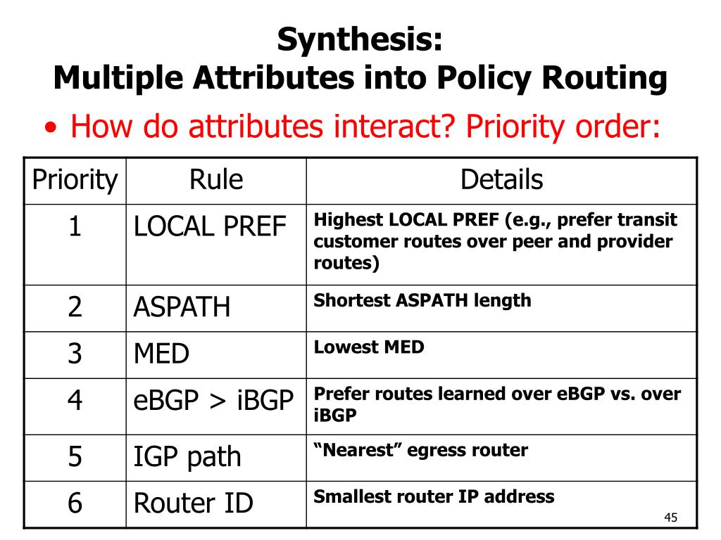 Synthesis:Multiple Attributes into Policy Routing • How do attributes interact? Priority order: