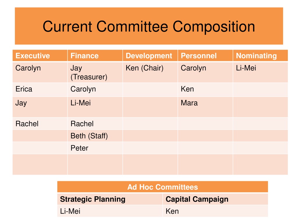 Board Member Expectations (cont.) • Fundraising: Playing an active role in fundraising, including: • Making a personal annual contribution commensurate with household income • Helping raise funds by working on a fundraising event or other activity • Using personal and professional networks to identify and cultivate potential donors • Time Commitment: Board members should expect to commit a minimum of 10 hours per month on the following: This includes: • Attending monthly board meetings (2 hours) • Attending a committee meeting (2 hours) • Preparing for board and committee meetings (2 hours) • Completing tasks outside of committee meetings (4 hours)