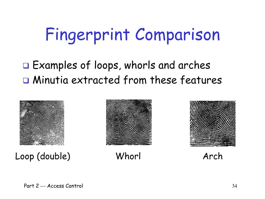 Fingerprint Comparison • Examples of loops, whorls and arches • Minutia extracted from these features Loop (double) Whorl Arch Part 2 Access Control 34