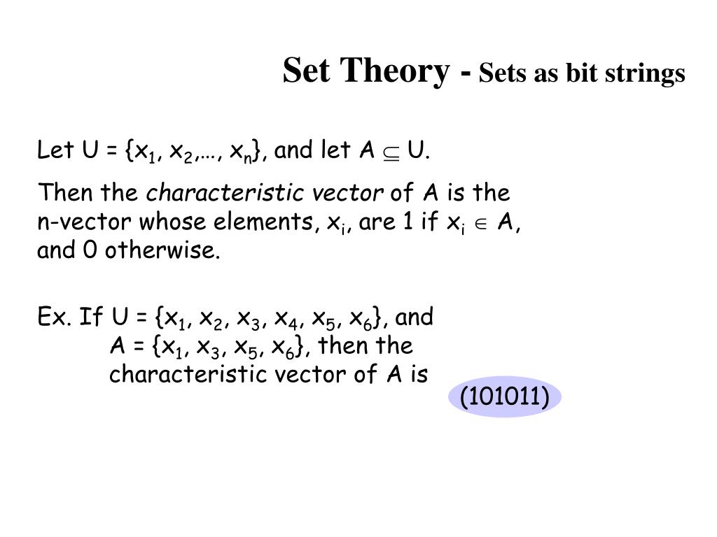 (101011) Set Theory - Sets as bit strings Let U = {x1, x2,…, xn}, and let A U. Then the characteristic vector of A is the n-vector whose elements, xi, are 1 if xi A, and 0 otherwise. Ex. If U = {x1, x2, x3, x4, x5, x6}, and A = {x1, x3, x5, x6}, then the characteristic vector of A is