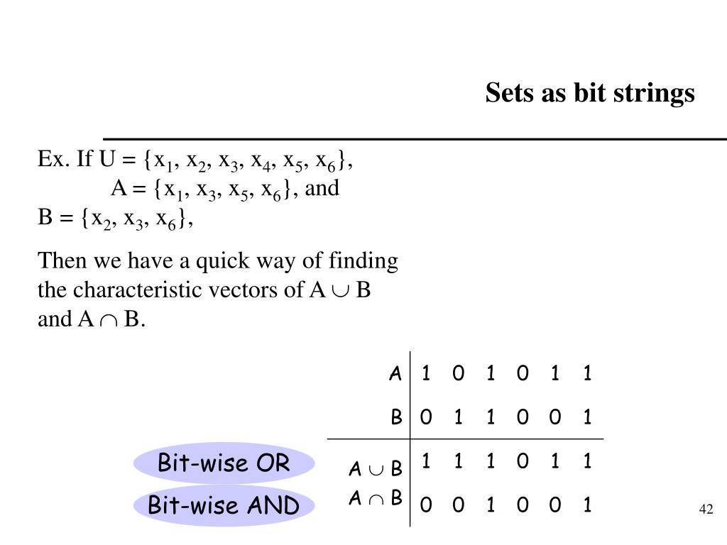Bit-wise OR Bit-wise AND Sets as bit strings Ex. If U = {x1, x2, x3, x4, x5, x6}, A = {x1, x3, x5, x6}, and B = {x2, x3, x6}, Then we have a quick way of finding the characteristic vectors of A B and A B.
