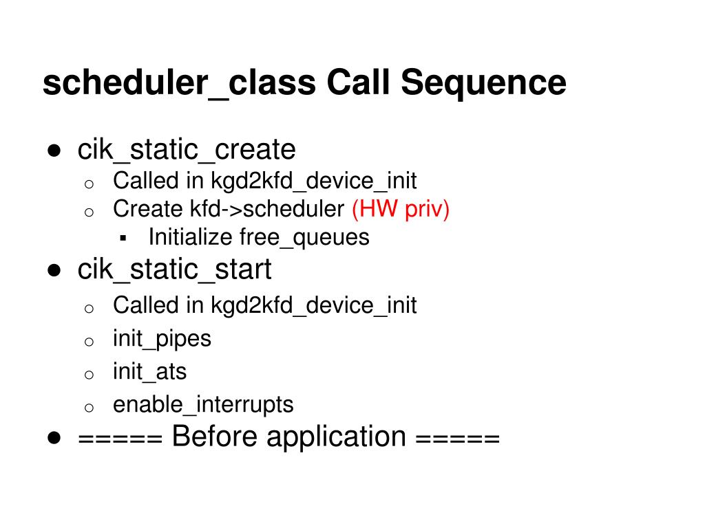 scheduler_class Call Sequence • cik_static_create • Called in kgd2kfd_device_init • Create kfd->scheduler (HW priv) • Initialize free_queues • cik_static_start • Called in kgd2kfd_device_init • init_pipes • init_ats • enable_interrupts • ===== Before application =====