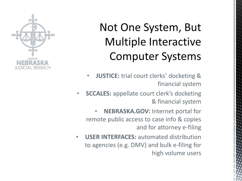 Not One System, But Multiple Interactive Computer Systems JUSTICE: trial court clerks’ docketing & financial system SCCALES: appellate court clerk’s docketing & financial system NEBRASKA.GOV: Internet portal for remote public access to case info & copies and for attorney e-filing USER INTERFACES: automated distribution to agencies (e.g. DMV) and bulk e-filing for high volume users