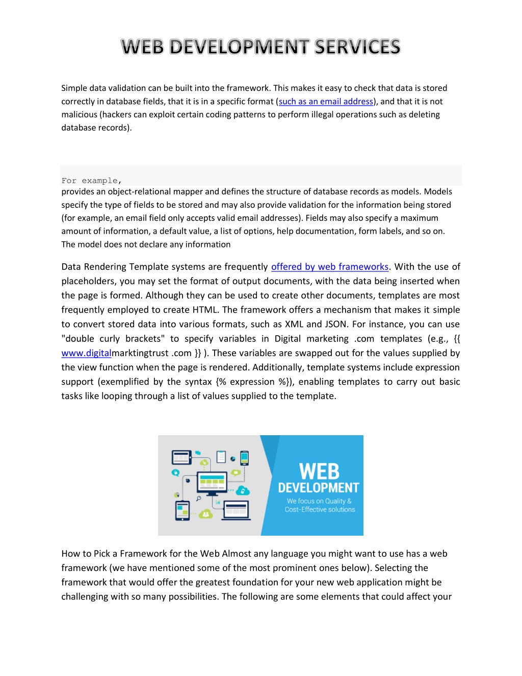2. Simple data validation can be built into the framework. This makes it easy to check that data is stored correctly in database fields, that it is in a specific format (such as an email address), and that it is not malicious (hackers can exploit certain coding patterns to perform illegal operations such as deleting database records). For example, provides an object-relational mapper and defines the structure of database records as models. Models specify the type of fields to be stored and may also provide validation for the information being stored (for example, an email field only accepts valid email addresses). Fields may also specify a maximum amount of information, a default value, a list of options, help documentation, form labels, and so on. The model does not declare any information Data Rendering Template systems are frequently offered by web frameworks. With the use of placeholders, you may set the format of output documents, with the data being inserted when the page is formed. Although they can be used to create other documents, templates are most frequently employed to create HTML. The framework offers a mechanism that makes it simple to convert stored data into various formats, such as XML and JSON. For instance, you can use "double curly brackets" to specify variables in Digital marketing .com templates (e.g., {{ www.digitalmarktingtrust .com }} ). These variables are swapped out for the values supplied by the view function when the page is rendered. Additionally, template systems include expression support (exemplified by the syntax {% expression %}), enabling templates to carry out basic tasks like looping through a list of values supplied to the template. How to Pick a Framework for the Web Almost any language you might want to use has a web framework (we have mentioned some of the most prominent ones below). Selecting the framework that would offer the greatest foundation for your new web application might be challenging with so many possibilities. The following are some elements that could affect your