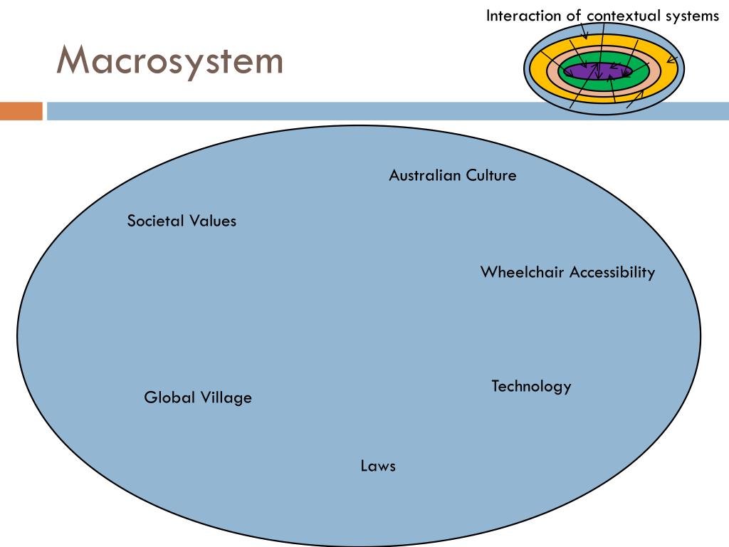 Interaction of contextual systems Macrosystem Australian Culture Societal Values Wheelchair Accessibility Technology Global Village Laws