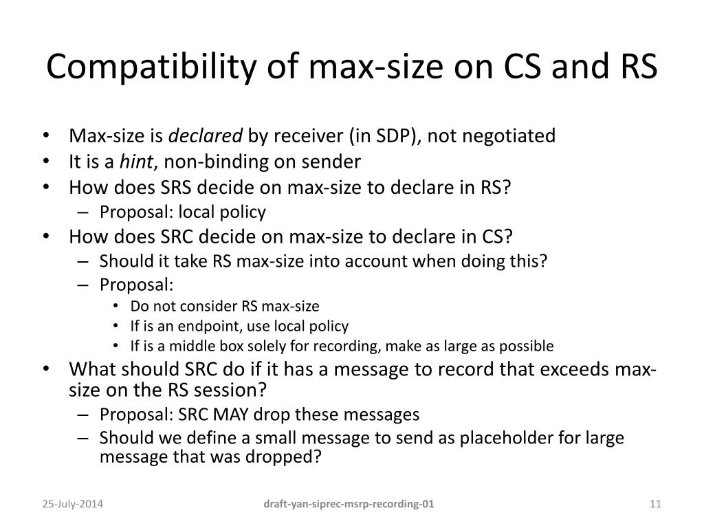 Compatibility of max-size on CS and RS • Max-size is declared by receiver (in SDP), not negotiated • It is a hint, non-binding on sender • How does SRS decide on max-size to declare in RS? • Proposal: local policy • How does SRC decide on max-size to declare in CS? • Should it take RS max-size into account when doing this? • Proposal: • Do not consider RS max-size • If is an endpoint, use local policy • If is a middle box solely for recording, make as large as possible • What should SRC do if it has a message to record that exceeds max-size on the RS session? • Proposal: SRC MAY drop these messages • Should we define a small message to send as placeholder for large message that was dropped? draft-yan-siprec-msrp-recording-01