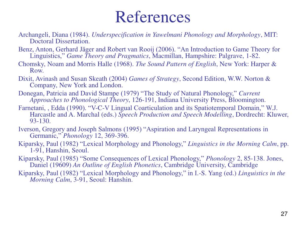 References Archangeli, Diana (1984). Underspecification in Yawelmani Phonology and Morphology, MIT: Doctoral Dissertation. Benz, Anton, Gerhard Jäger and Robert van Rooij (2006). “An Introduction to Game Theory for Linguistics,” Game Theory and Pragmatics, Macmillan, Hampshire: Palgrave, 1-82. Chomsky, Noam and Morris Halle (1968). The Sound Pattern of English, New York: Harper & Row. Dixit, Avinash and Susan Skeath (2004) Games of Strategy, Second Edition, W.W. Norton & Company, New York and London. Donegan, Patricia and David Stampe (1979) “The Study of Natural Phonology,” Current Approaches to Phonological Theory, 126-191, Indiana University Press, Bloomington. Farnetani, , Edda (1990). “V-C-V Lingual Coarticulation and its Spatiotemporal Domain,” W.J. Harcastle and A. Marchal (eds.) Speech Production and Speech Modelling, Dordrecht: Kluwer, 93-130. Iverson, Gregory and Joseph Salmons (1995) “Aspiration and Laryngeal Representations in Germanic,” Phonology 12, 369-396. Kiparsky, Paul (1982) “Lexical Morphology and Phonology,” Linguistics in the Morning Calm, pp. 1-91, Hanshin, Seoul. Kiparsky, Paul (1985) “Some Consequences of Lexical Phonology,” Phonology 2, 85-138. Jones, Daniel (19609) An Outline of English Phonetics, Cambridge University, Cambridge Kiparsky, Paul (1982) “Lexical Morphology and Phonology,” in I.-S. Yang (ed.) Linguistics in the Morning Calm, 3-91, Seoul: Hanshin.