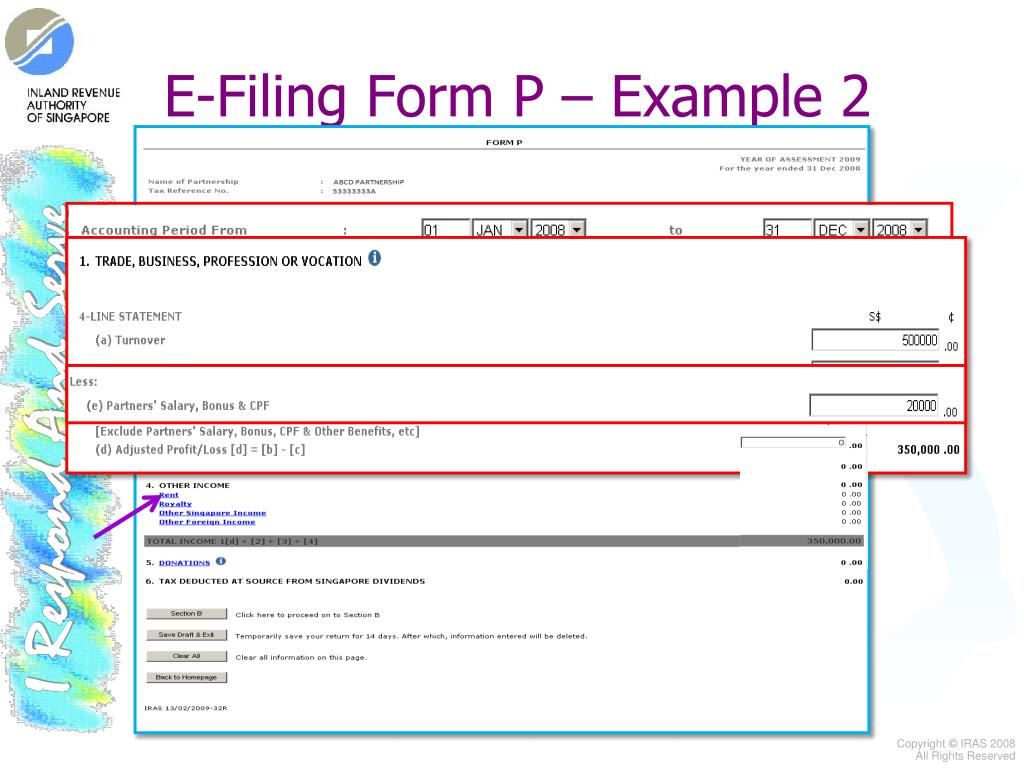 E-Filing Form P – Example 2 • ABCD Partnership (53333333A). • Precedent Partner, Tan (F1234567A) doing the filing with his IRAS Pin and has been authorised as an APPROVER. • Pre-Filled with 3 partners, Tan (F1234567A), Neo (S7654321Z) and Tay (S1212121C). • Partner 4’s (Ouyang) particulars was not pre-filled. • Partnership converted to a Sole-Proprietorship business on 25/12/2008. • Partner’s salary of $20,000 to NEO. • Rental (Gross Rent $55,000 with $25,000 property tax paid) to Tan. • Divisible Profit/(Loss) to be shared equally among the 4 partners.