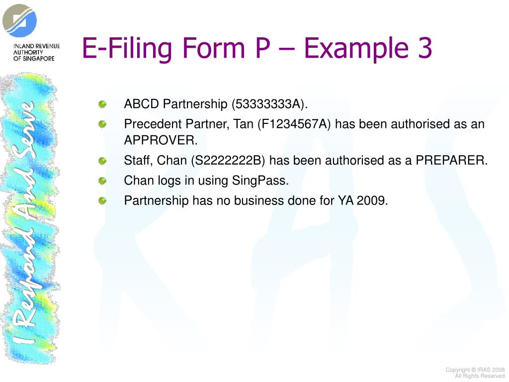 E-Filing Form P – Example 1 • ABCD Partnership (53333333A) has no business done for YA 2009. • Precedent Partner, Tan (F1234567A) is doing the filing with his IRAS Pin and has been authorised as an APPROVER.