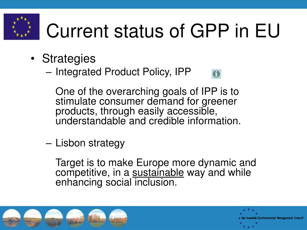 Current status of GPP in EU • Strategies • Integrated Product Policy, IPPOne of the overarching goals of IPP is to stimulate consumer demand for greener products, through easily accessible, understandable and credible information. • Lisbon strategyTarget is to make Europe more dynamic and competitive, in a sustainable way and while enhancing social inclusion.