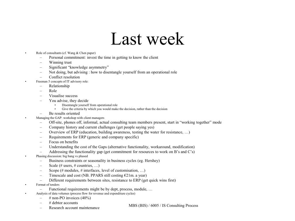Role of consultants (cf. Wang & Chen paper) Personal commitment: invest the time in getting to know the client Winning trust Significant “knowledge asymmetry” Not doing, but advising : how to disentangle yourself from an operational role Conflict resolution Freeman 5 concepts of IT advisory role: Relationship Role Visualise success You advise, they decide Disentangle yourself from operational role Give the criteria by which you would make the decision, rather than the decision Be results oriented Managing the GAP: workshop with client managers Off-site, phones off, informal, actual consulting team members present, start in “working together” mode Company history and current challenges (get people saying yes) Overview of ERP (education, building awareness, testing the water for resistance, …) Requirements for ERP (generic and company specific) Focus on benefits Understanding the cost of the Gaps (alternative functionality, workaround, modification) Addressing the functionality gap (get commitment for resources to work on B’s and C’s) Phasing discussion: big bang vs phased Business constraints or seasonality in business cycles (eg. Hershey) Scale (# users, # countries, …) Scope (# modules, # interfaces, level of customisation, …) Timescale and cost (NB. PPARS still costing €21m. a year) Different requirements between sites, resistance to ERP (get quick wins first) Format of tenders Functional requirements might be by dept, process, module, … Analysis of data volumes (process flow for revenue and expenditure cycles) # non-PO invoices (40%) # debtor accounts Research account maintenance Last week MBS (BIS) / 6005 / IS Consulting Process