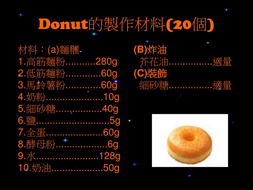 Donut的製作材料(20個) 材料:(a)麵糰 (B)炸油 1.高筋麵粉...........280g 芥花油................適量 2.低筋麵粉.............60g (C)裝飾 3.馬鈴薯粉.............60g 細砂糖................適量 4.奶粉.....................10g 5.細砂糖.................40g 6.鹽...........................5g 7.全蛋.....................60g 8.酵母粉...................6g 9.水.......................128g 10.奶油...................50g