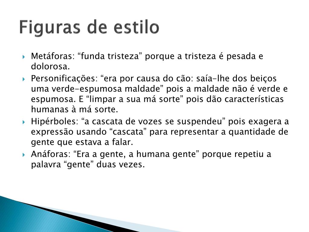 Figuras de estilo • Metáforas: “funda tristeza” porque a tristeza é pesada e dolorosa. • Personificações: “era por causa do cão: saía-lhe dos beiços uma verde-espumosa maldade” pois a maldade não é verde e espumosa.E “limpar a sua má sorte” pois dão características humanas à má sorte. • Hipérboles: “a cascata de vozes se suspendeu” pois exagera a expressão usando “cascata” para representar a quantidade de gente que estava a falar. • Anáforas: “Era a gente, a humana gente” porque repetiu a palavra “gente” duas vezes.