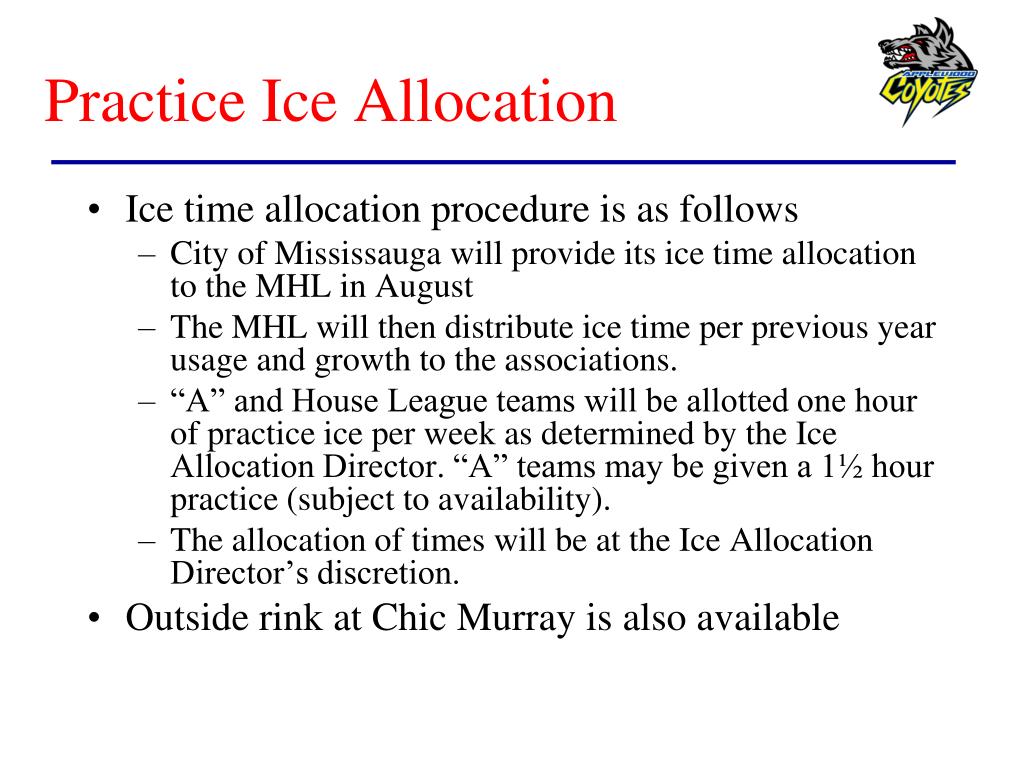 Practice Ice Allocation • Ice time allocation procedure is as follows • City of Mississauga will provide its ice time allocation to the MHL in August • The MHL will then distribute ice time per previous year usage and growth to the associations. • “A” and House League teams will be allotted one hour of practice ice per week as determined by the Ice Allocation Director. “A” teams may be given a 1½ hour practice (subject to availability). • The allocation of times will be at the Ice Allocation Director’s discretion. • Outside rink at Chic Murray is also available