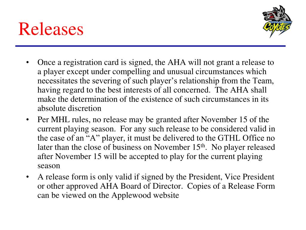 Releases • Once a registration card is signed, the AHA will not grant a release to a player except under compelling and unusual circumstances which necessitates the severing of such player’s relationship from the Team, having regard to the best interests of all concerned. The AHA shall make the determination of the existence of such circumstances in its absolute discretion • Per MHL rules, no release may be granted after November 15 of the current playing season. For any such release to be considered valid in the case of an “A” player, it must be delivered to the GTHL Office no later than the close of business on November 15th. No player released after November 15 will be accepted to play for the current playing season • A release form is only valid if signed by the President, Vice President or other approved AHA Board of Director. Copies of a Release Form can be viewed on the Applewood website