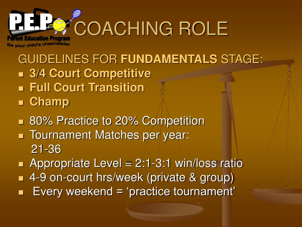 P.E.P Parent Education Program Be your child's cheerleader COACHING ROLE GUIDELINES FOR FUNDAMENTALS STAGE: • 3/4 Court Competitive • Full Court Transition • Champ • 80% Practice to 20% Competition • Tournament Matches per year: 21-36 • Appropriate Level = 2:1-3:1 win/loss ratio • 4-9 on-court hrs/week (private & group) • Every weekend = ‘practice tournament’