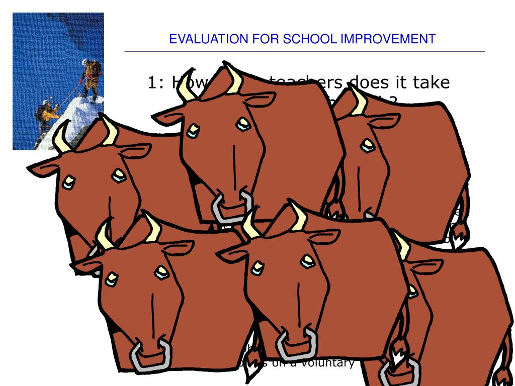 EVALUATION FOR SCHOOL IMPROVEMENT 1: How many teachers does it take to change a light-bulb? Well hang on a minute! You can't go changing a light-bulb just like that. You need a plan - long, medium and short-term - or your method of changing the bulb will be in question. And of course, you need to be very clear what you are trying to achieve by changing it - that will need writing down and handing out to anybody who happens to be watching you change the light-bulb. Furthermore, some account will need to be made for the fact that the light bulb may not be very bright - you can't just discard it. You will also need to spend time assessing your procedure after the event, with a clear emphasis on taking the bulb-changing process to the next stage. Oh and there is the question of changing other bulbs on a voluntary basis after hours..
