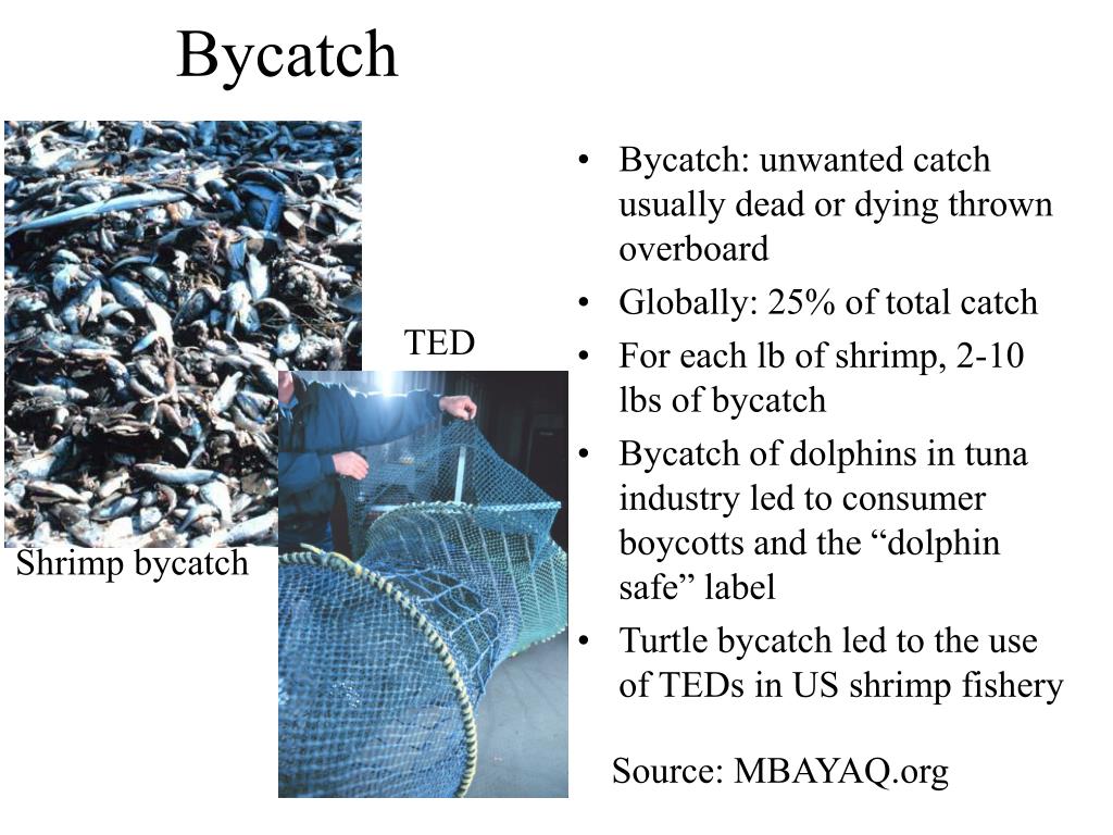 Bycatch • Bycatch: unwanted catch usually dead or dying thrown overboard • Globally: 25% of total catch • For each lb of shrimp, 2-10 lbs of bycatch • Bycatch of dolphins in tuna industry led to consumer boycotts and the “dolphin safe” label • Turtle bycatch led to the use of TEDs in US shrimp fishery TED Shrimp bycatch Source: MBAYAQ.org