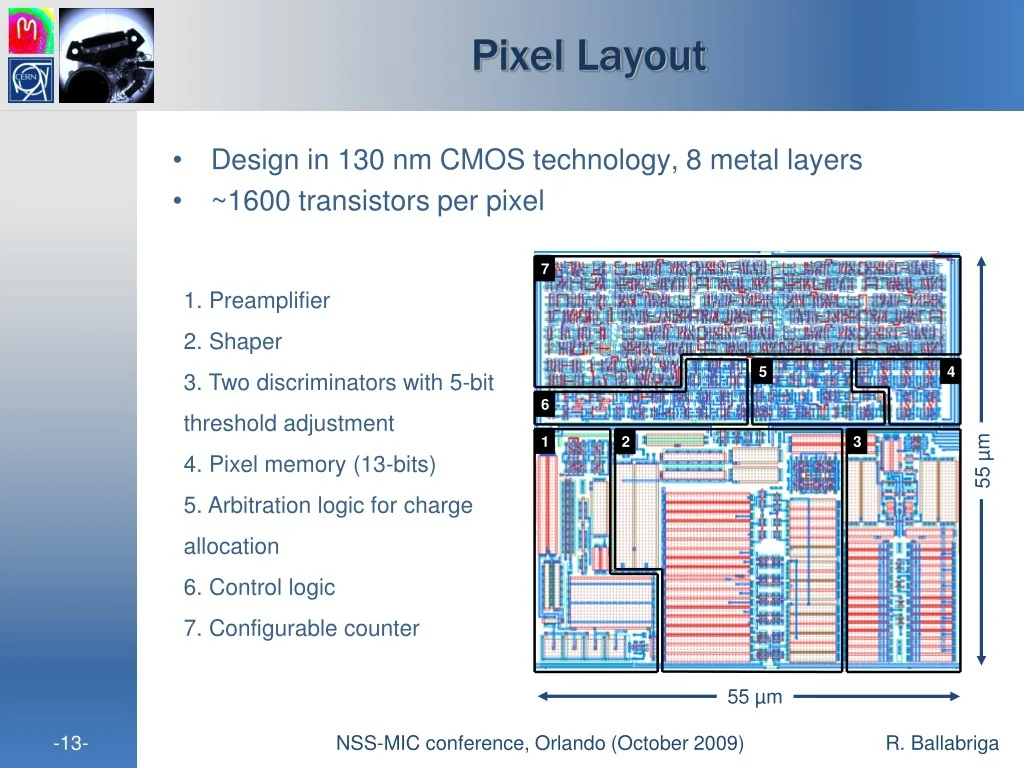 Design in 130 nm CMOS technology, 8 metal layers ~1600 transistors per pixel Pixel Layout • 1. Preamplifier • 2. Shaper • 3. Two discriminators with 5-bit threshold adjustment • 4. Pixel memory (13-bits) • 5. Arbitration logic for charge allocation • 6. Control logic • 7. Configurable counter 55 µm 55 µm