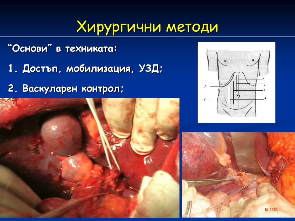 “Основи” в техниката: • 3. Минимална кръвозагуба с адекватна субституция • 4. Превенция на • хеморагията; • билирагията Хирургични методи