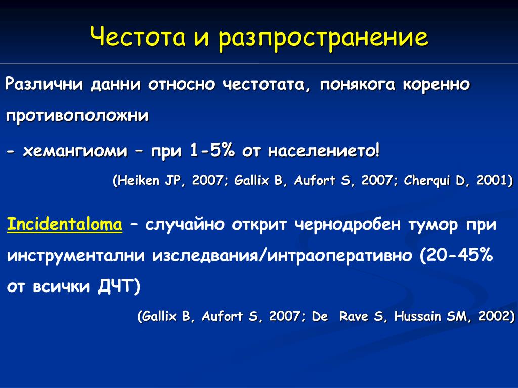 Честота и разпространение Incidentaloma – случайно открит чернодробен тумор при инструментални изследвания/интраоперативно (20-45% от всички ДЧТ) (Gallix B, Aufort S, 2007; De Rave S, Hussain SM, 2002) Различни данни относно честотата, понякога коренно противоположни - хемангиоми – при 1-5% от населението! (Heiken JP, 2007; Gallix B, Aufort S, 2007; Cherqui D, 2001)