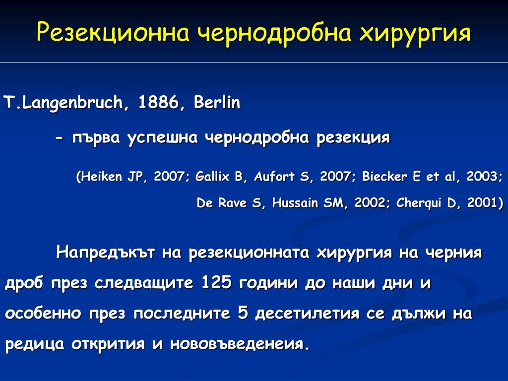 T.Langenbruch, 1886, Berlin - първа успешна чернодробна резекция Резекционна чернодробна хирургия (Heiken JP, 2007; Gallix B, Aufort S, 2007;Biecker E et al, 2003; De Rave S, Hussain SM, 2002; Cherqui D, 2001) Напредъкът на резекционната хирургия на черния дроб през следващите 125 години до наши дни и особенно през последните 5 десетилетия се дължи на редица открития и нововъведенеия.