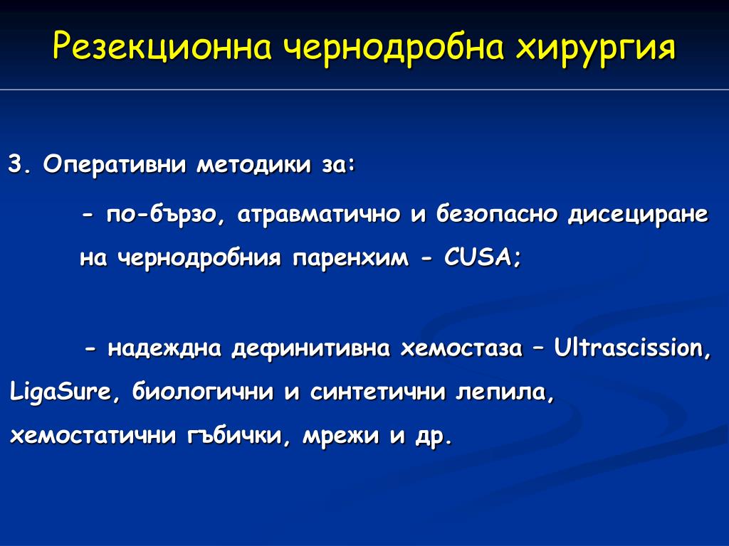 3. Оперативни методики за: - по-бързо, атравматично и безопасно дисециране на чернодробния паренхим - CUSA; Резекционна чернодробна хирургия - надеждна дефинитивна хемостаза – Ultrascission, LigaSure, биологични и синтетични лепила, хемостатични гъбички, мрежи и др.