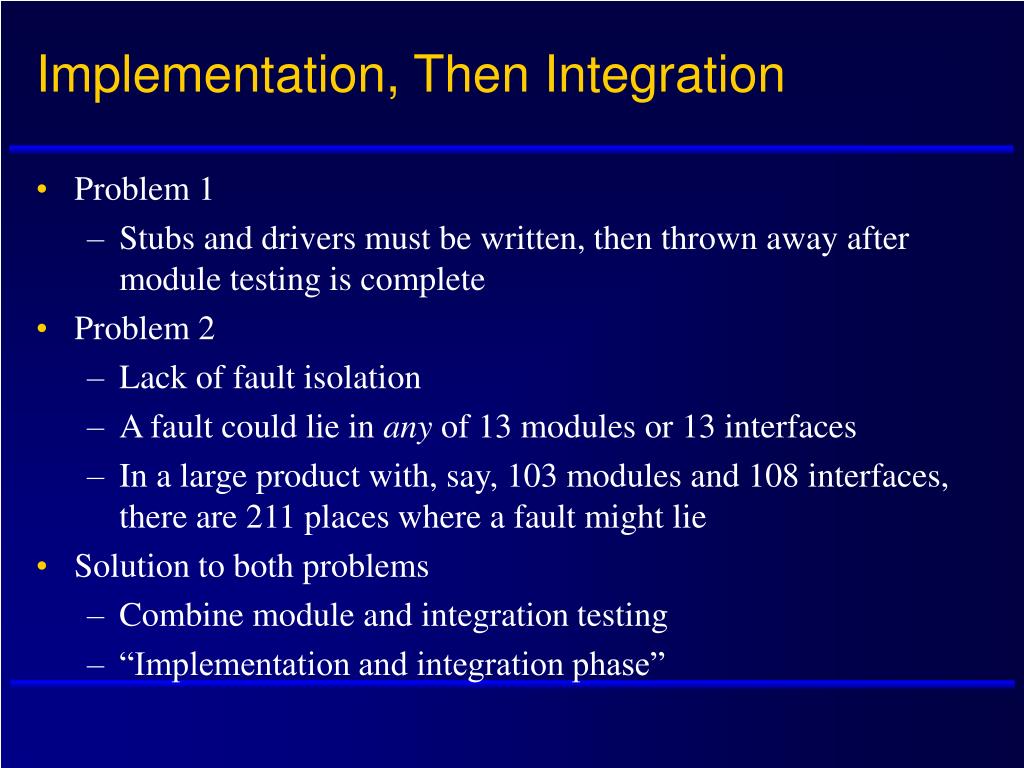 Implementation, Then Integration • Problem 1 • Stubs and drivers must be written, then thrown away after module testing is complete • Problem 2 • Lack of fault isolation • A fault could lie in any of 13 modules or 13 interfaces • In a large product with, say, 103 modules and 108 interfaces, there are 211 places where a fault might lie • Solution to both problems • Combine module and integration testing • “Implementation and integration phase”