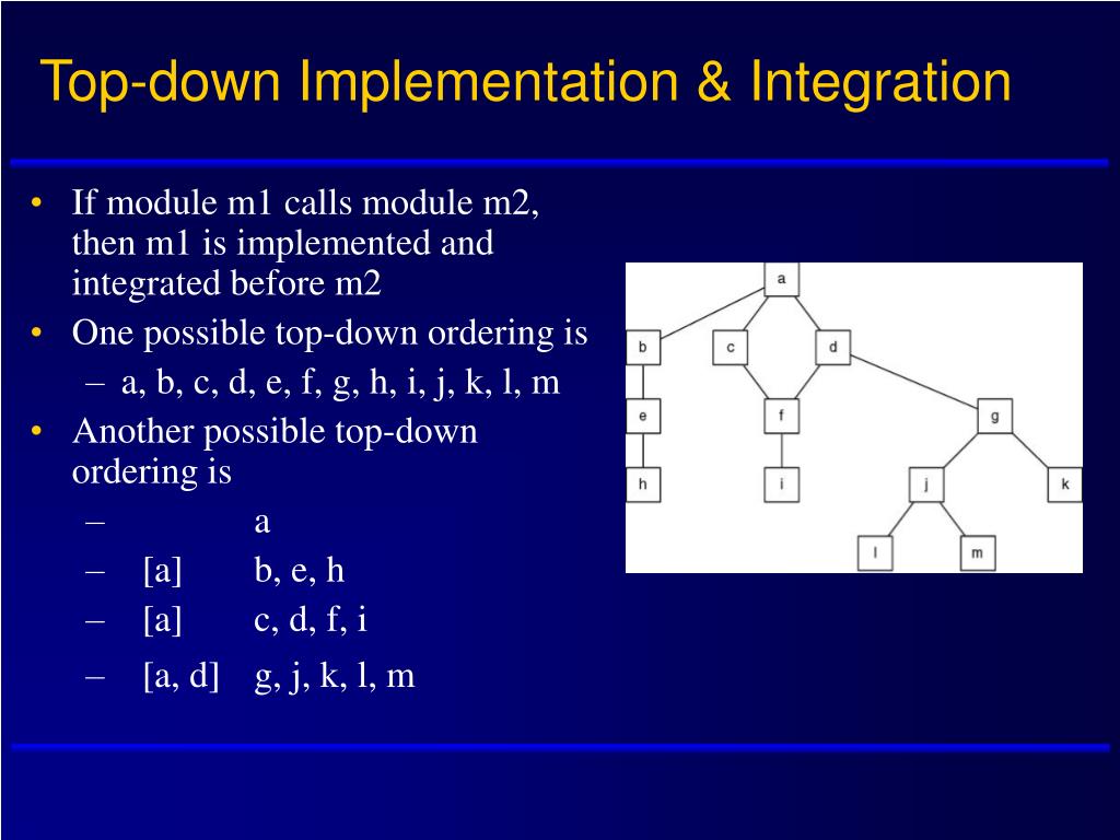 Top-down Implementation & Integration • If module m1 calls module m2, then m1 is implemented and integrated before m2 • One possible top-down ordering is • a, b, c, d, e, f, g, h, i, j, k, l, m • Another possible top-down ordering is • a • [a] b, e, h • [a] c, d, f, i • [a, d] g, j, k, l, m